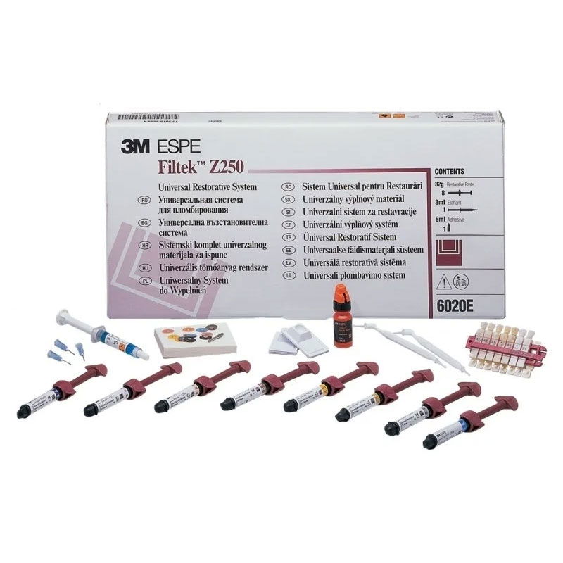 3M™ ESPE™ Filtek™ Z250 este un material compozit restaurativ universal fotopolimerizabil, radioopac, cu umplutura din zirconiu. E destinat atat dintilor frontali cat si laterali. Umplutura anorganica este de 60% din volum cu particule de la 0.01 to 3.5 µm. Filtek Z250 contine rasini BIS-GMA, UDMA si BIS-EMA. Se recomanda folosirea cu adeziv 3M, precum Adper Bond 2 .